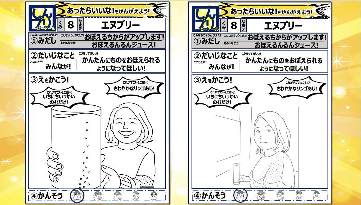 そして「③えをかこう!」。イラストの作成だけでなく、2つの「ここがすごいところ!」を考えてもらうのも特長です。商品のポイントを考えるという「情報発信力」を養うとともに、「イラストを文章で表現する」「文章をイラストで表現する」訓練を通して、表現力の幅の育成を意識しました。