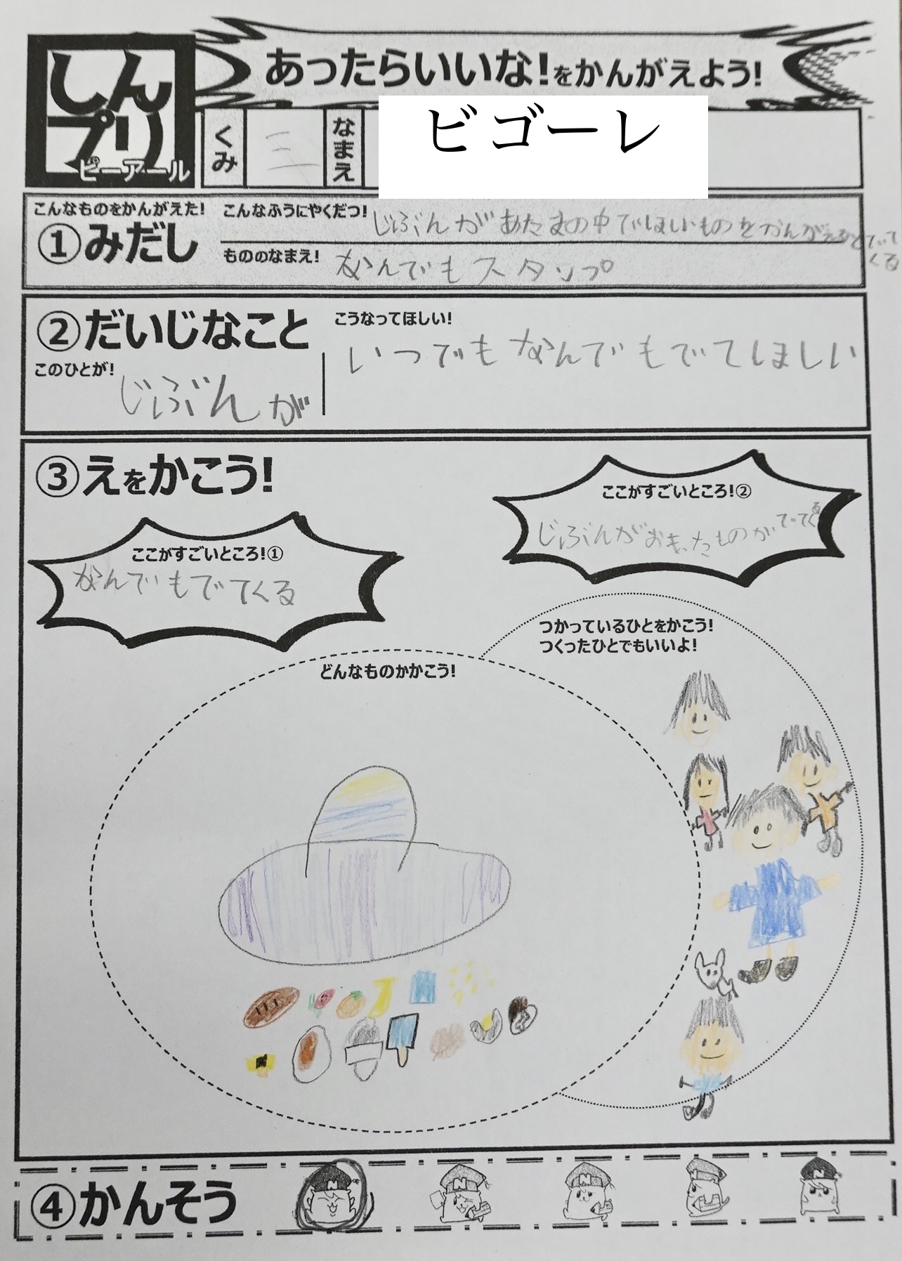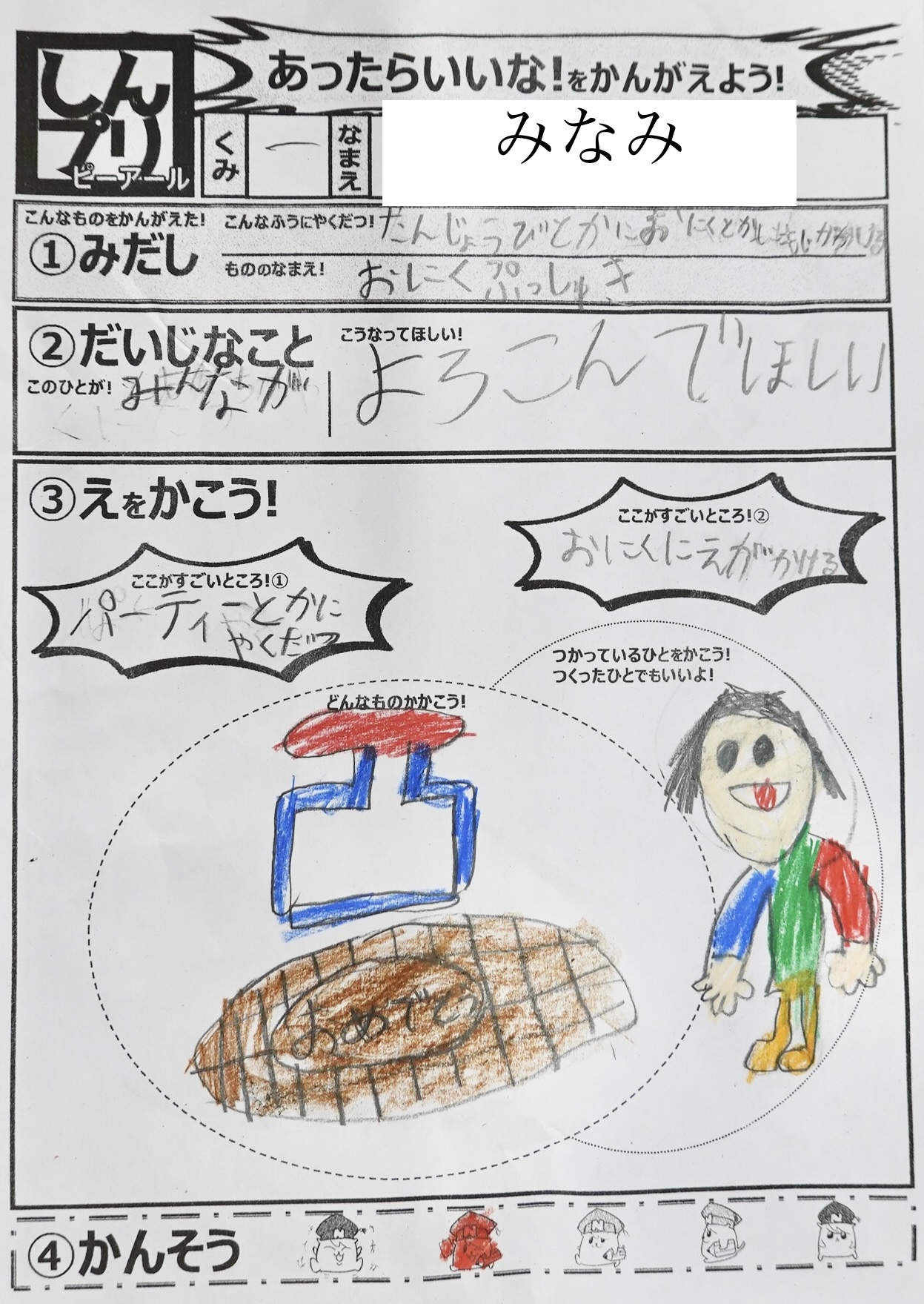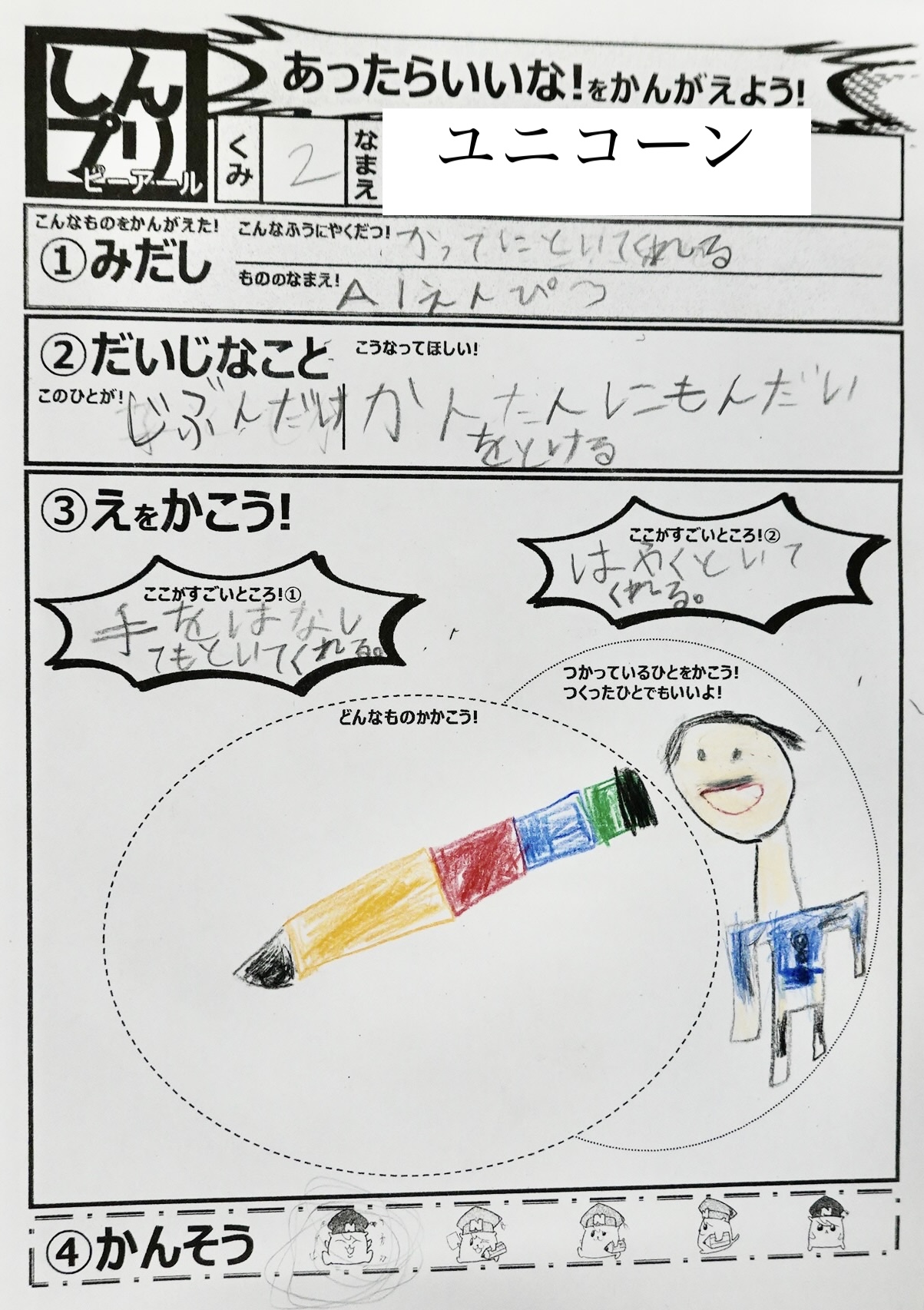 新プリPRでは、起業の起点になる「あったらいいな」という商品を考えてもらいます。イラストだけでなく、「①みだし」で「こんなふうにやくだつ!」と「もののなまえ!」を書いてもらいます。これは、「名前を考える=情報をまとめる」力と、「公共性への意識の向上」を図るのが目的です。