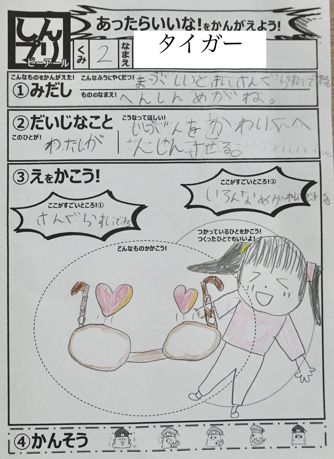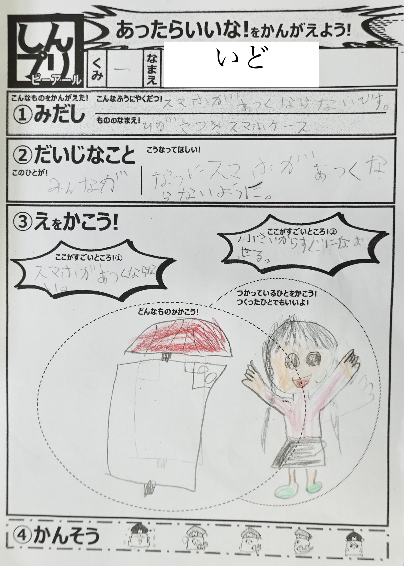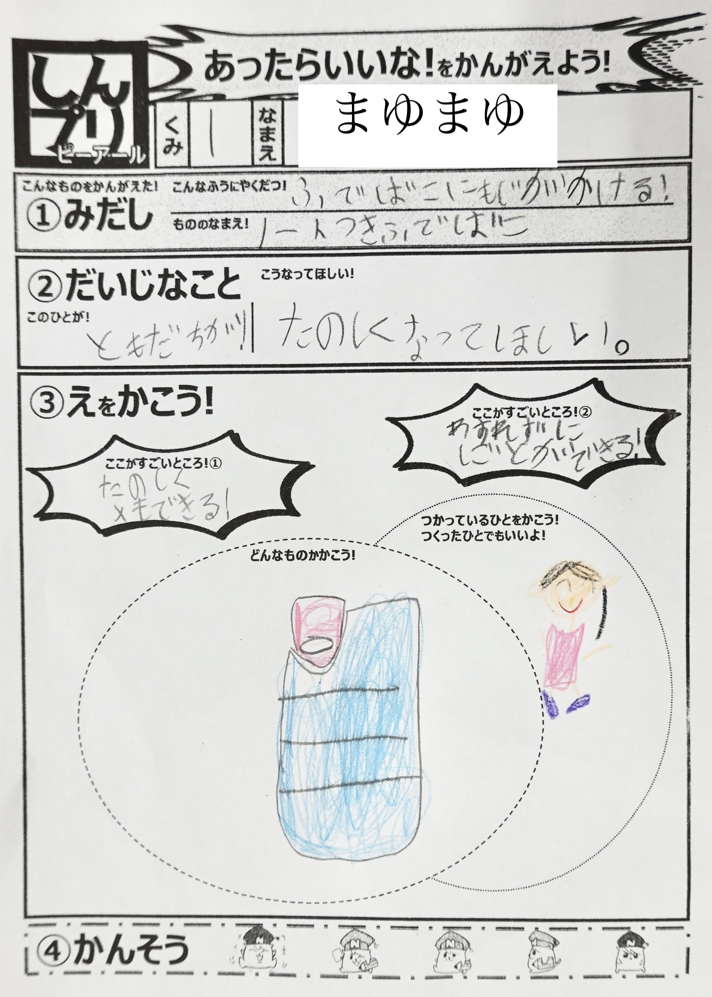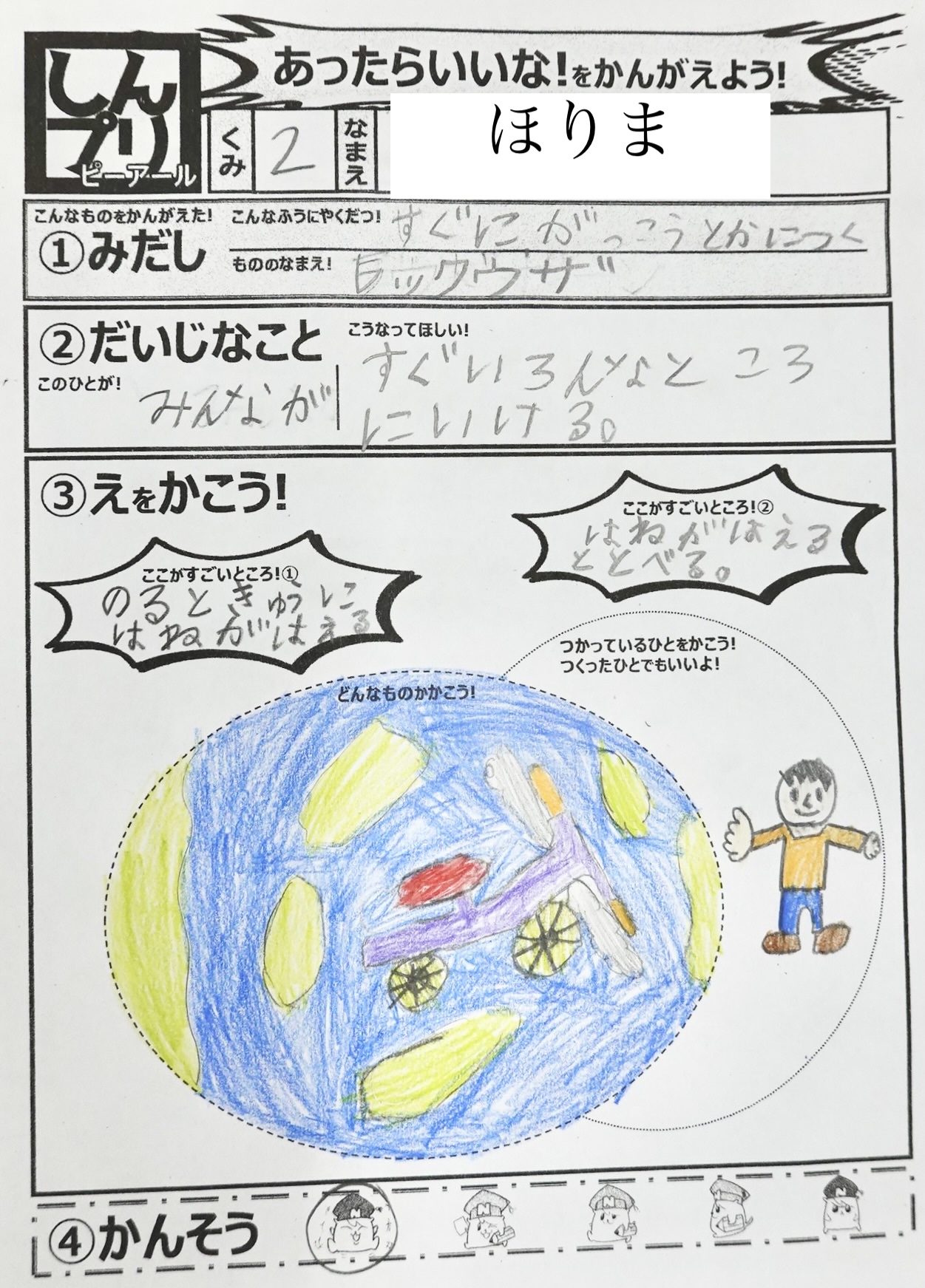 新プリPRでは、起業の起点になる「あったらいいな」という商品を考えてもらいます。イラストだけでなく、「①みだし」で「こんなふうにやくだつ!」と「もののなまえ!」を書いてもらいます。これは、「名前を考える=情報をまとめる」力と、「公共性への意識の向上」を図るのが目的です。